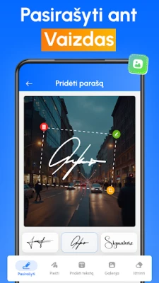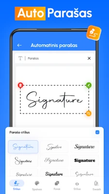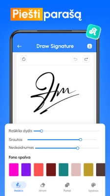 Programėlė siūlo platų parašų kūrimo galimybių spektrą. Galite nupiešti savo unikalų parašą tiesiai ekrane, naudodami intuityvų autografo redaktorių, arba nuskaityti esamą parašą su įrenginio kamera. Tiems, kurie vertina greitį, pakaks tiesiog įvesti savo vardą, ir „Electronic Signature Maker" automatiškai sugeneruos stilingą parašą. Kiekvieną parašą galima tobulinti keičiant spalvas, dydį, pasukimą ar net foną, taip užtikrinant, kad jūsų skaitmeninis parašas atrodytų profesionaliai ir atspindėtų jūsų individualumą. Sukūrus, parašą galima išsaugoti ir pakartotinai naudoti neribotą kiekį kartų.