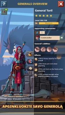 Pergalę lemia ne tik ginklai, bet ir protas! Atrakinkite legendinius generolus, kurių unikalūs talentai taps jūsų slaptuoju ginklu mūšio lauke. Apmokykite galingą riterių, lankininkų ir kalavijuočių armiją, aprūpinkite juos mirtinais ginklais ir leiskitės į keturių karalysčių užkariavimo žygį. Kiekvienas jūsų manevras, kiekviena gynybinė strategija turi būti tobula, kad atmuštumėte priešininkų atakas ir išplėstumėte savo žemes. Įrodykite, kad esate vertas šlovės ir sosto.