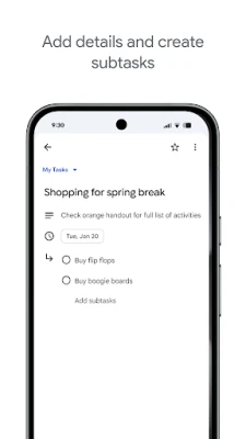 Valdykite savo dieną su neprilygstamu detalumu, naudodami „Google Tasks" galimybes. Suskaidykite dideles užduotis į lengvai valdomas smulkesnes dalis, kad kiekvienas žingsnis taptų aiškus ir pasiekiamas. Pridėkite išsamias pastabas ir kontekstą prie kiekvieno įrašo, užtikrindami, kad niekada nepamiršite svarbios informacijos, ir atnaujinkite jas realiuoju laiku, kai tik atliekate darbą. Ši programa puikiai integruojasi su Jūsų jau naudojamomis „Google" paslaugomis: mobiliajame įrenginyje be vargo tvarkykite užduotis, sukurtas „Gmail" ar „Kalendoriuje" žiniatinklyje. Be to, paverskite el. laiškus tiesioginėmis užduotimis ir stebėkite jų eigą patogiai „Gmail" šoniniame skydelyje, visuomet matydami susietą pradinį laišką.